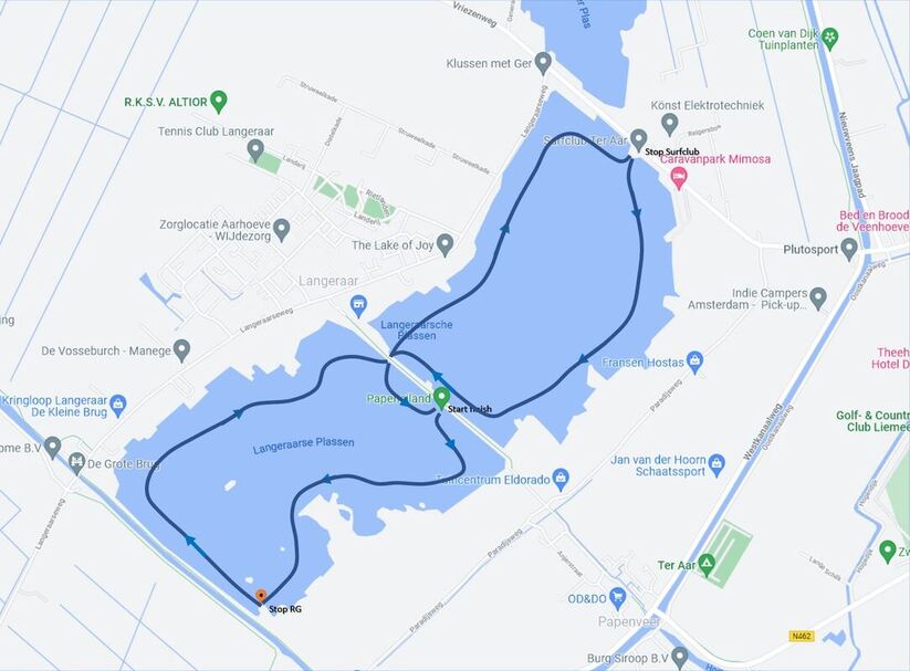 Deze voert over de 2 Langeraarse Plassen, met onderweg 4 stopplaatsen waar een activiteit is georganiseerd. Ook worden er consumpties verstrekt op 2 van de stop plekken.